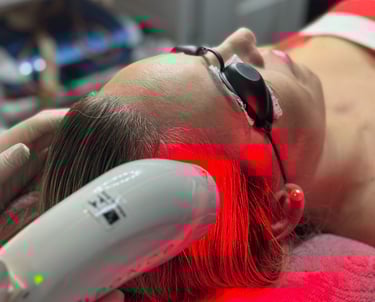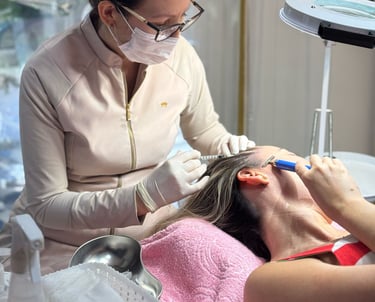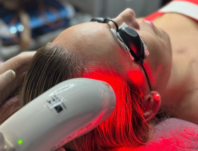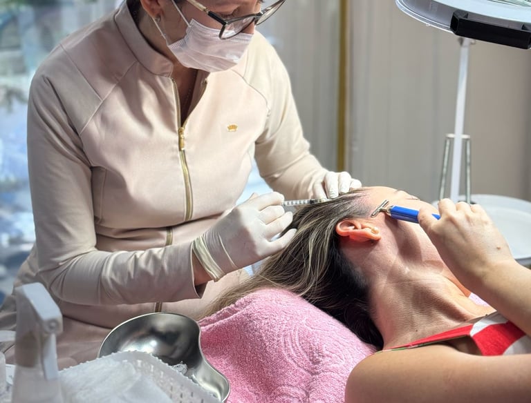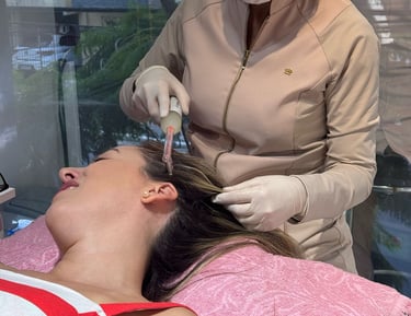 Tratamento estético com ativos vasodilatadores, microagulhamento e LED capilar, estimulando o crescimento e fortalecendo os folículos.